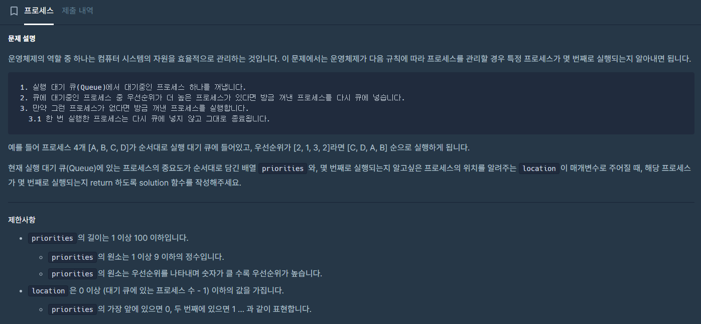 이 문제 에서는 우선순위가 높은 프로세스가 먼저 처리 되어야 하므로 높은 숫자가 우선 순위인 우선순위 큐를 사용해야 한다.