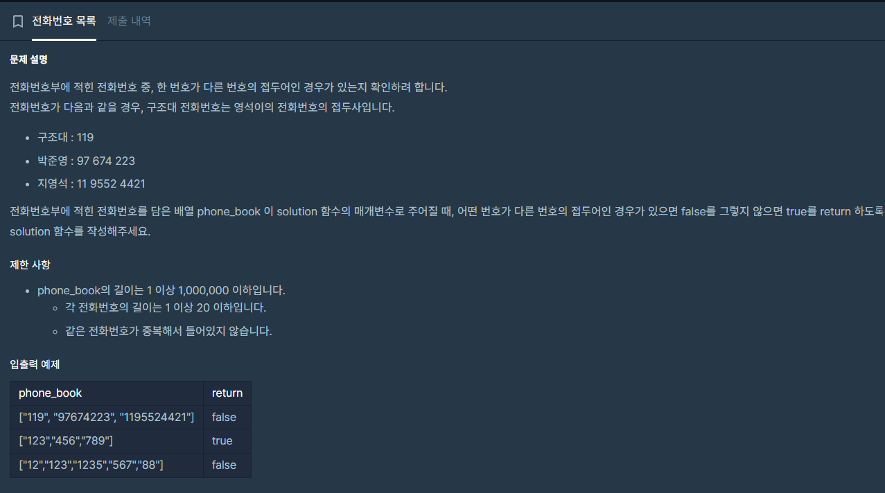 처음에는 배열의 숫자들을 정수형으로 변형하고, 순회하며 자릿수를 체크하고 그 뒤의 숫자들의 처음부터 차릿수 까지의 숫자가 일치하면 answer를 false로 바꾸면 되겠다 싶어 구현했지만 고려하지 못한 케이스도 있고 시간복잡도 때문에 오답이 생기는 케이스가 생겼다.