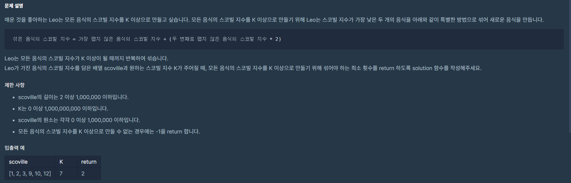 만약 힙의 크기가 2 이하이면 스코빌 지수를 섞을 수 없기 때문에 -1을 리턴해준다.