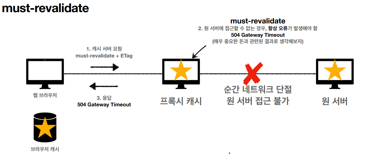 must-revalidate 는 원 서버와의 단절이 일어나면 항상 오류를 발생시킨다.