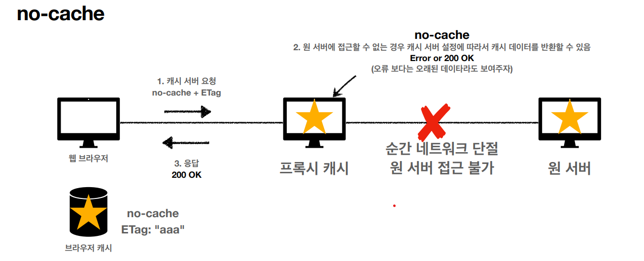 no-cache는 원 서버와의 단절이 일어났을때 오래된 데이터라도 보여주면서 200OK를 보낸다