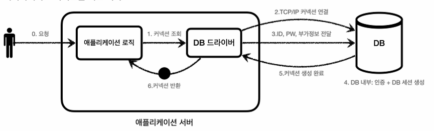 데이터베이스 커넥션을 획득하기 위해서는 DB드라이버가 DB와 TCP/IP커넥션을 연결한다.