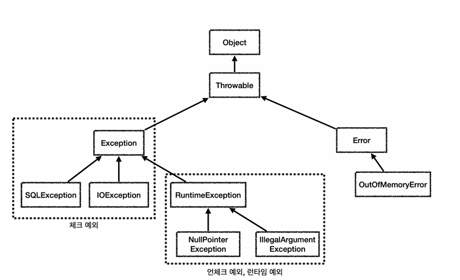 - Exception = 컴파일러가 체크하는 체크 예외이며, 애플리케이션 로직에서 사용할 수 있는 실질적인 최상위 예외이다.