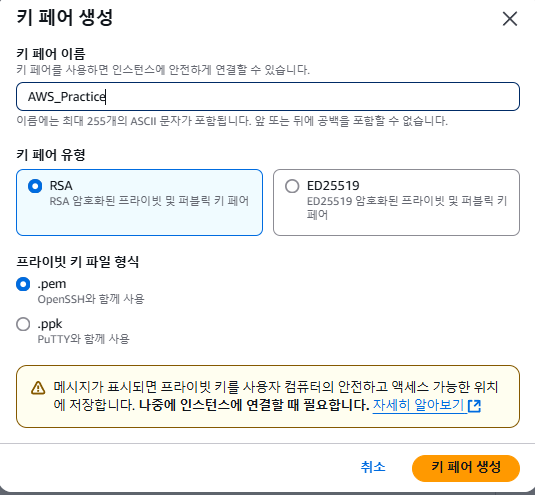 키 페어 이름은 어떤 EC2에 접근하기 위한 키 페어였는 지 알아볼 수 있게 지정하고