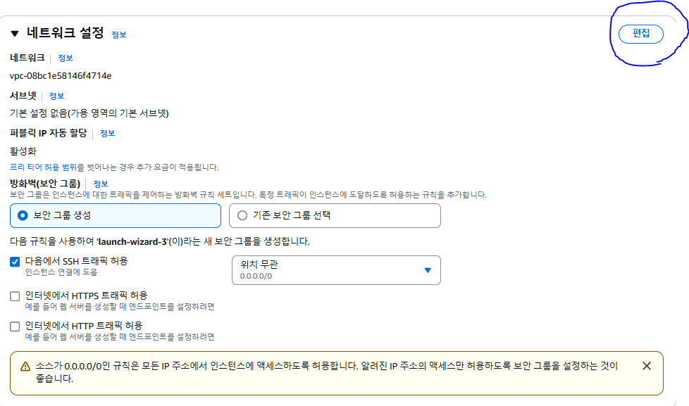 이제 네트워크 설정을 통해 보안그룹을 생성해줘야 한다.