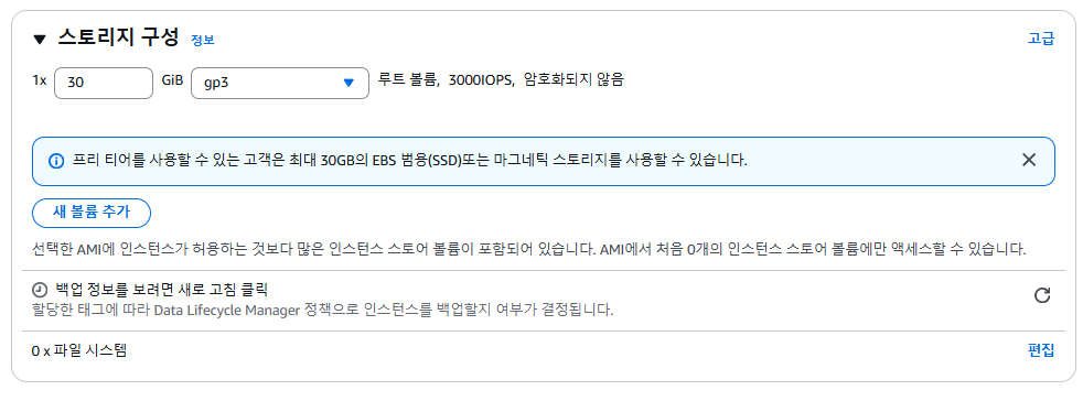 30GB까지는 프리티어 이므로 30GB로 설정!