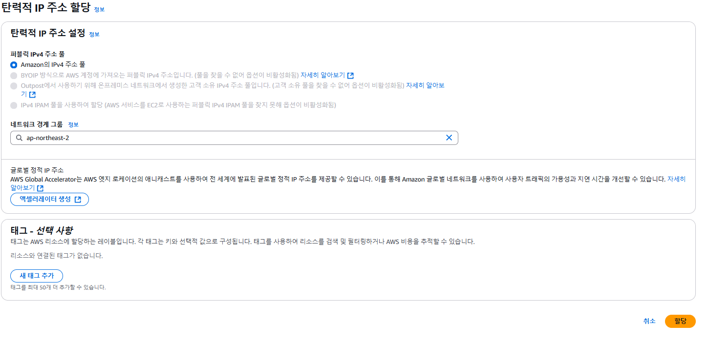 우측 상단의 탄력적 IP 주소 할당 클릭!
