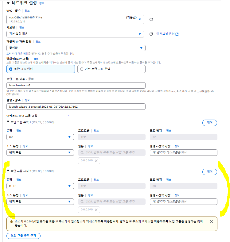 이제 네트워크 설정을 통해 보안그룹을 생성해줘야 한다.