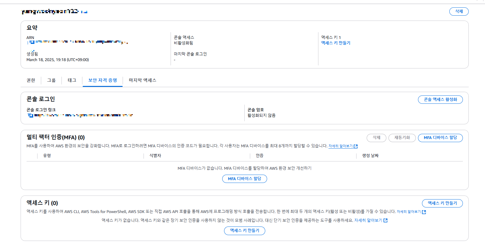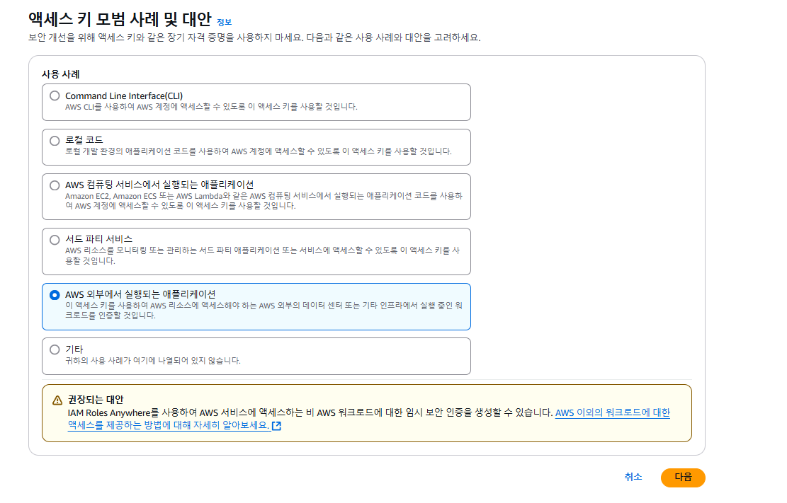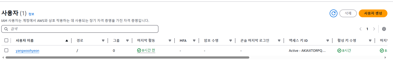 이제 애플리케이션 서버에서 파일 업로드 하기위한 Access Key를 받기 위해 액세스 키 생성을 해줘야 한다.