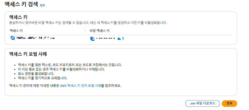 액세스 키 생성하기를 하면 액세스 키와 비밀 액세스 키가 생성되는데