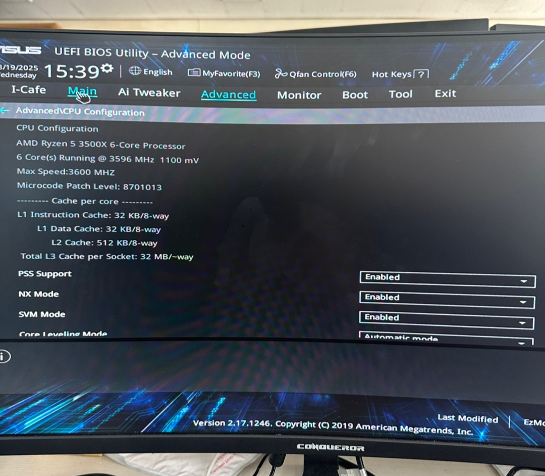 3. CPU Configuration 클릭 후 SVM Mode를 Enabled로 변경
