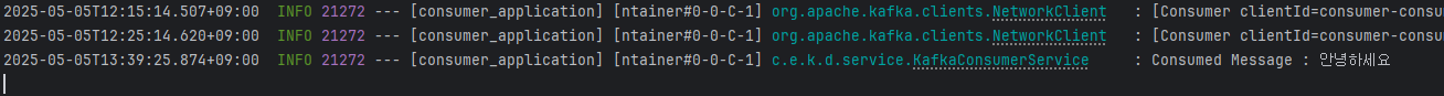 실행 결과 Consumer에서 정상적으로 메시지가 도착한 것을 확인할 수 있었다.