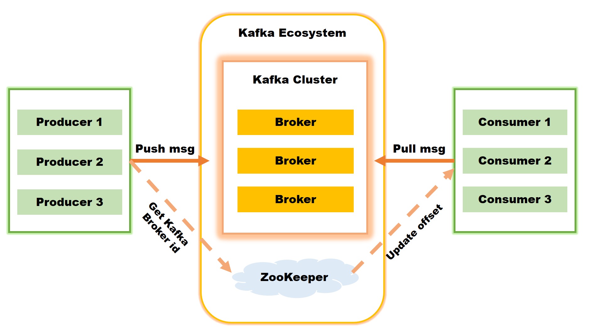 Kafka의 주요 구성 요소중 Broker, Zookeeper는 카프카 클러스터를 구성하는 것들이다. Apache Zookeeper는 카프카 클러스터 윗 단에서 역할을 하고 Broker는 카프카 클러스터 내에서 역할을 한다.