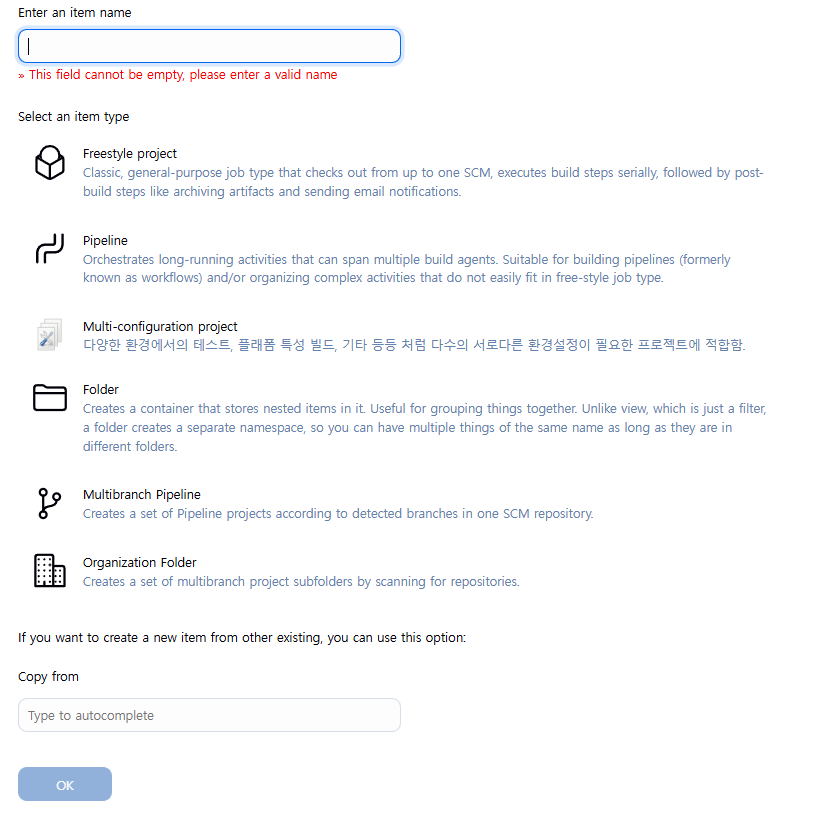 여기서 `새로운 Item` 을 클릭하여 pipeline을 생성해준다.