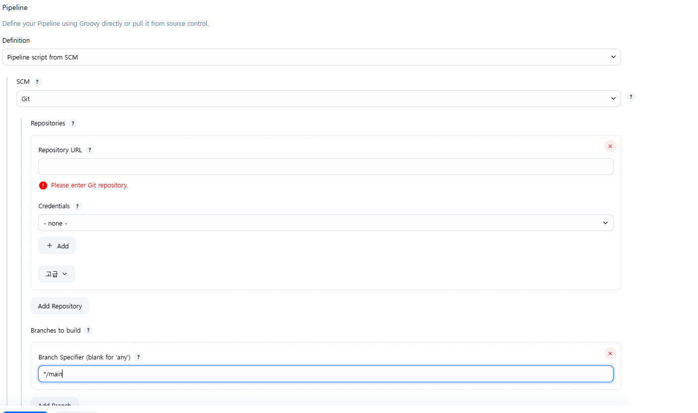 만약 private 리포지토리라면 Credentials값을 추가하여 연동해줘야 한다.