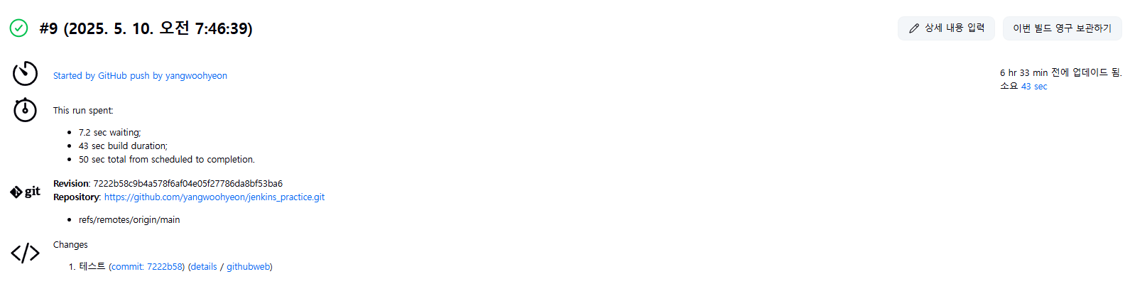 이제 로컬 환경에서 리포지토리로 push해주면 jenkins에서 Docker Image를 빌드하고 Docker Hub에 업로드 된 후 EC2(Spring)에 반영되는 것을 확인할 수 있다.