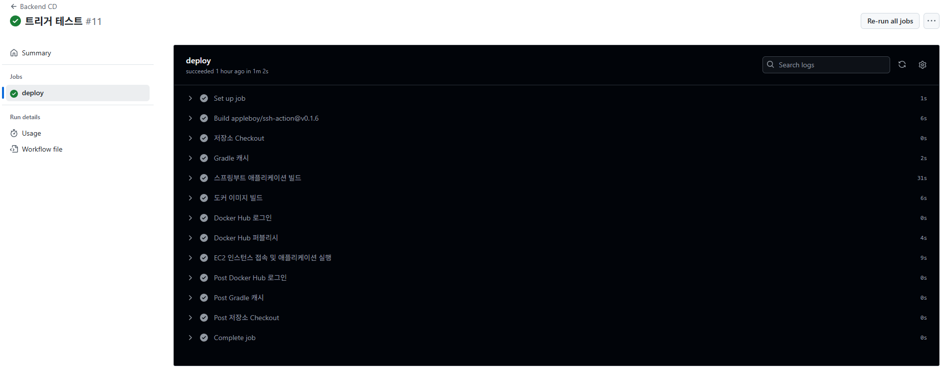 GitHub에 push만 하면 → Spring 빌드 → Docker 이미지 빌드 → DockerHub에 푸시 → EC2에 자동 배포까지 완료되는 워크플로우가 완성된다.