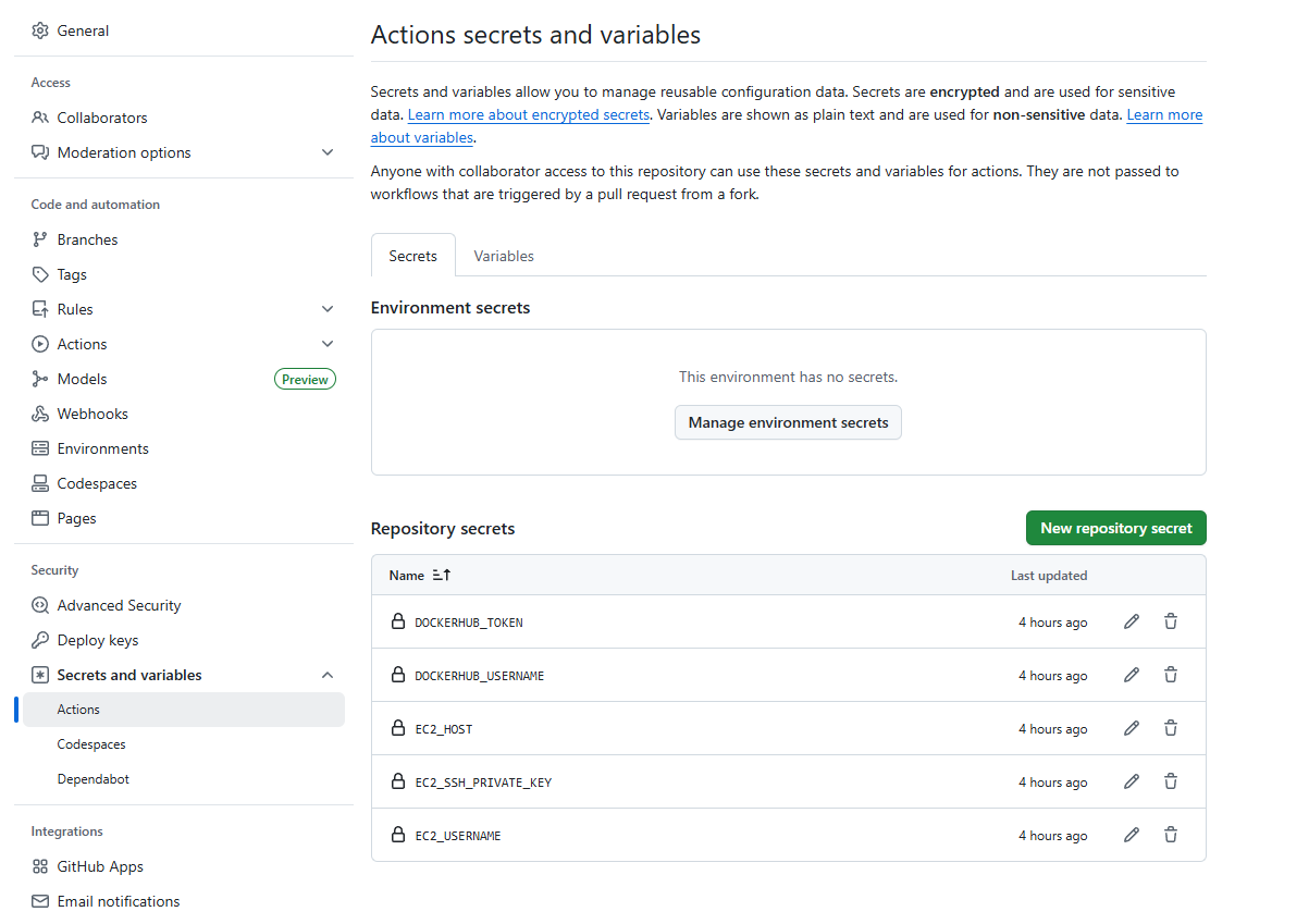 리포지토리 생성 후 Access token을 발급받아 GitHub의 Actions secrets and variables에 등록해줘야 GitHub Actions가 DockerHub에 로그인해서 자동으로 이미지 push/pull 할수 있게 된다.