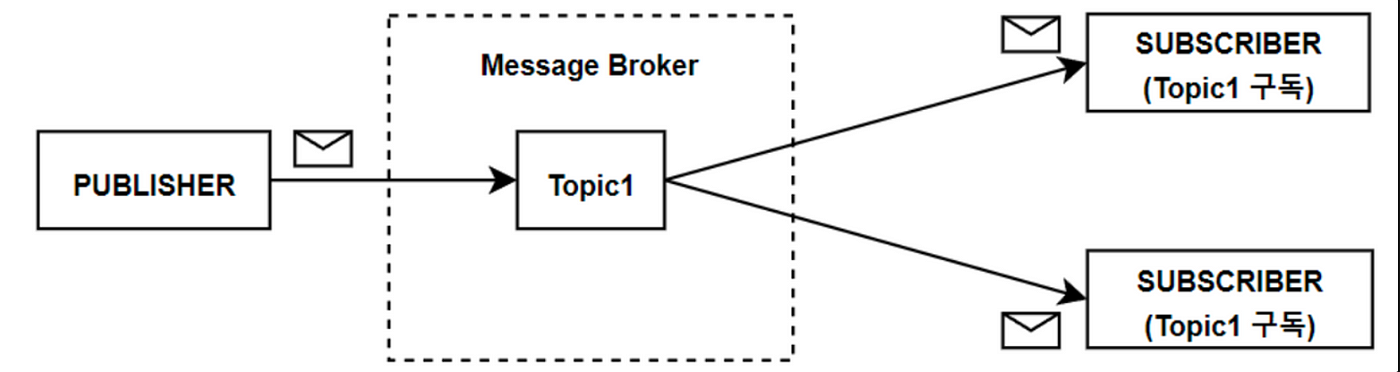 메시지 브로커와 publisher - subscriber 방식을 사용하고, 메시지 브로커는 발행자가 전송하는 메시지를 구독자들에게 전송한다.