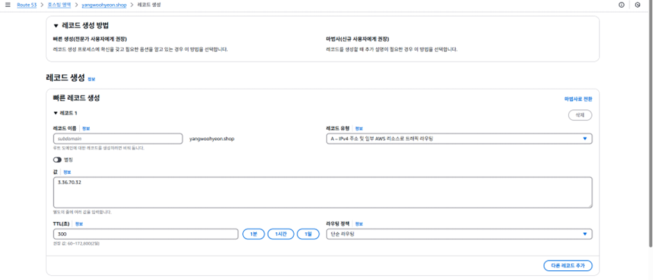 여기서 NS 유형의 "값/트래픽 라우팅 대상"은 가비아에 나중에 등록해줘야 한다.