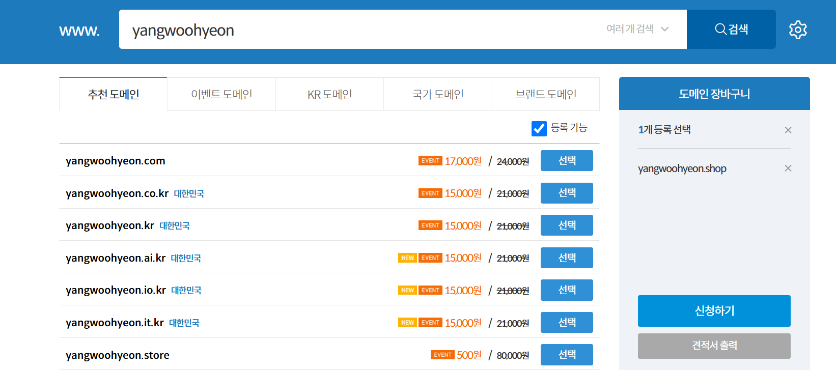 나는 yangwoohyeon.shop을 500원에 구입했다.