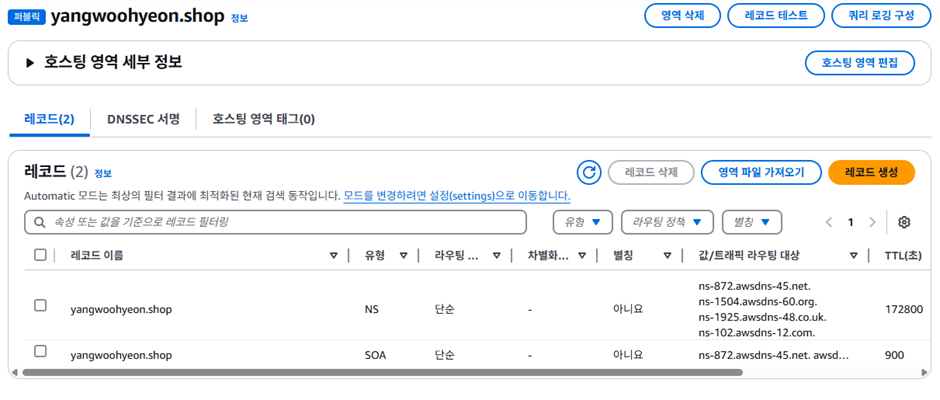 호스팅 영역을 생성해주면 아래 사진과 같은 화면이 보인다.