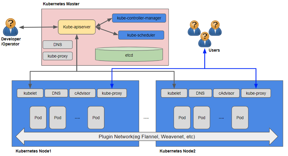 Kubernetes Master(마스터)와 Kubernetes Node(노드)로 나뉜다.