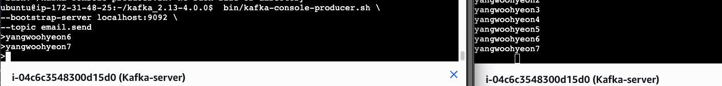 위 명령어를 사용하면 메시지 내용을 입력할 수 있는 칸이 나오고 원하는 값을 입력하고 Enter를 누르면 된다.(종료 : Ctrl + c)