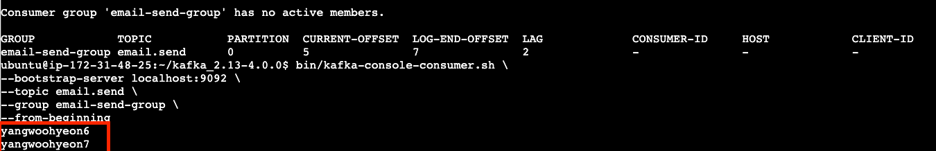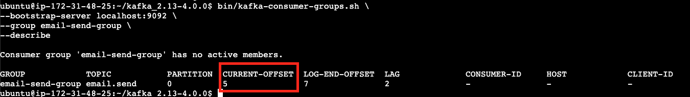 아래 명령어를 통해 실제로 CURRENT-OFFSET 부터 메시지를 읽는 것을 확인 가능하다.