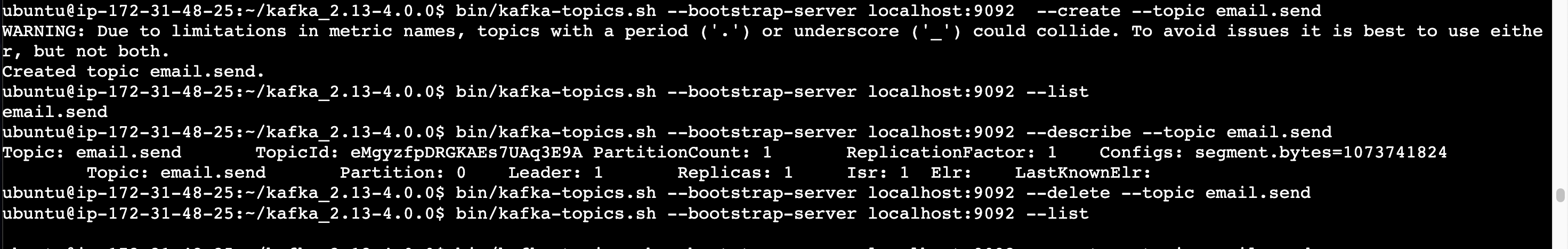위 명령어를 사용하여 Topic 생성, 조회, 삭제까지 해봤다.