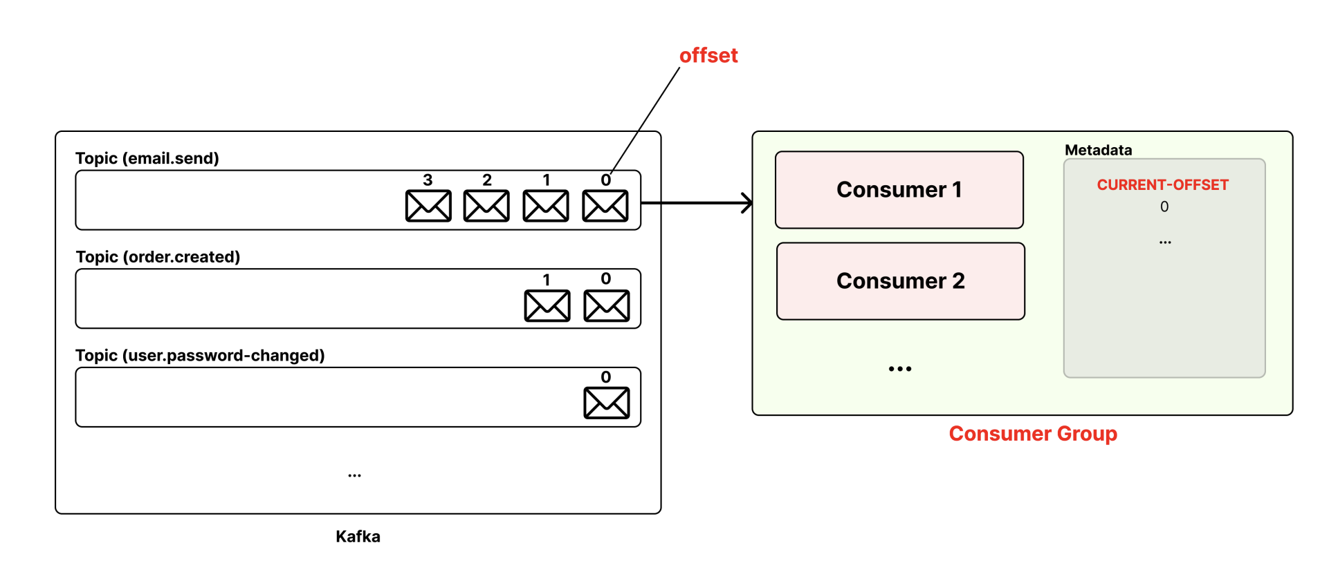 Kafka는 컨슈머 그룹(Consumer Group)이라는 개념을 활용하여 각 컨슈머 그룹이 어디까지 메시지를 읽었는지 Offset이라는 번호로 기록한다.