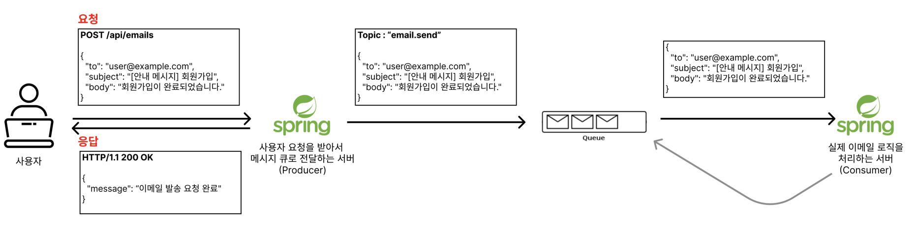 - Producer 서버는 메시지 큐에 메시지를 넣자마자 사용자에게 성공 응답을 보낸다.(비동기 방식 처리)