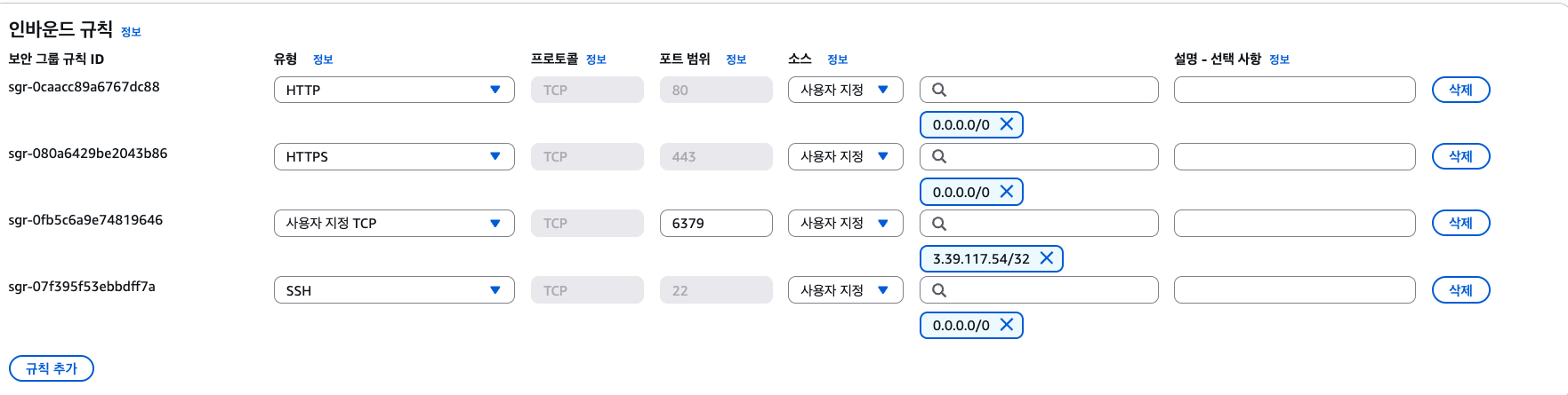 웹 서버에서 Redis서버로 접근이 가능하게 하기 위해서는 Redis 서버의 보안그룹에서 웹서버 IP에서 Redis 서버의 6379포트로 접근가능하도록 인바운드 규칙을 편집해줘야 한다.