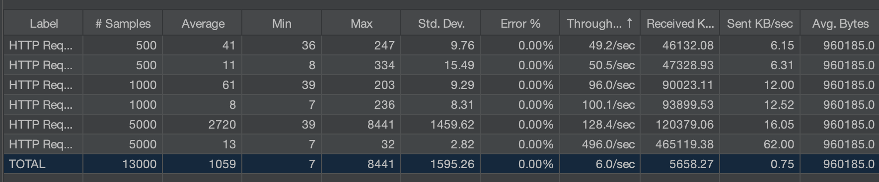 요청수가 5000회인 경우 캐시 없이 DB에서 데이터를 조회할때는 평균응답이 2720ms까지 나타났지만 Redis를 적용한 경우 5000번의 요청에서도 13ms의 평균 응답을 유지했다.