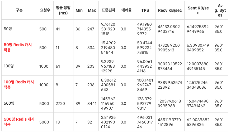 이 테스트를 통해 Redis 캐시를 사용할 경우 낮은 부하보다 높은 부하 환경에서 성능을 극대화 시킬 수 있다는 것을 알게되었다.