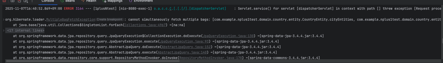 국가와 함께 각 국가에 속한 도시 목록까지 조회하려고 하면 상황이 달라진다. 먼저 국가 목록을 가져오는 쿼리가 한 번 실행되고, 이후 템플릿에서 cityEntities 컬렉션에 접근하는 순간 각 국가마다 해당 도시에 대한 지연 로딩 쿼리가 추가로 발생한다. 그 결과 국가 수(N)만큼 도시 조회 쿼리가 반복 실행되어 총 1 + N개의 쿼리가 발생하는 것을 확인할 수 있다.