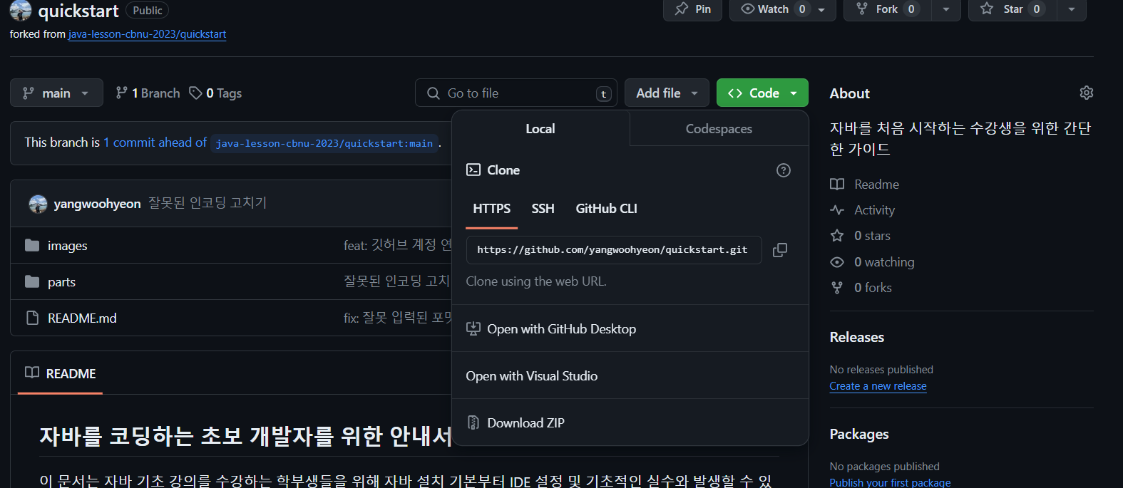 URL에 리포지토리의 주소를 복사하고 실행하면 아래 사진과 같이 잘 Clone 된것을 확일 할 수 있다