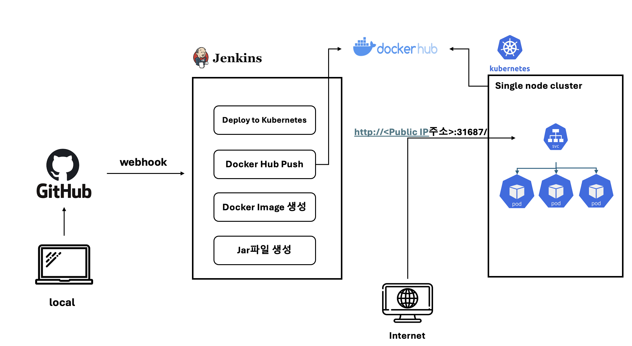 GitHub - yangwoohyeon/kubernetes-jenkins-cicdContribute to yangwoohyeon/kubernetes-jenkins-cicd development by creating an account on GitHub.github.com 싱글 노드 쿠버내티스 클러스터 + Jenkins CI/CD + DockerHub 기반 자동 배포 Pipeline을 구축해봤다. 쿠버내티스 워커 노드를 구성하기 위한 최소 사양은 다음과 같다.• CPU: 2 vCPU 이상• 메모리(RAM): 2GB 이상• 디스크 용량: 20~30GB 이상 AWS EC2 인스턴스 기준으로 최소 t3.medium이상을 사용해야한다. 여러개의 인스턴스를 생성하여 부하 분산도 테스트 해보고 싶었지만 프리티어 초과..